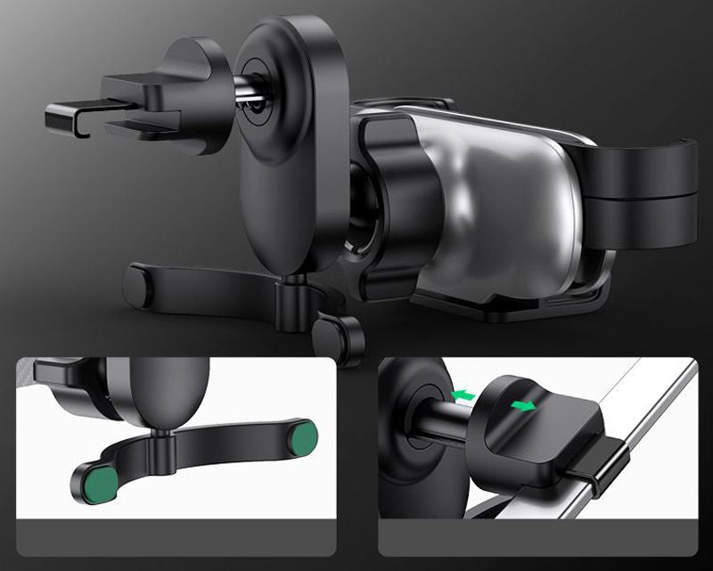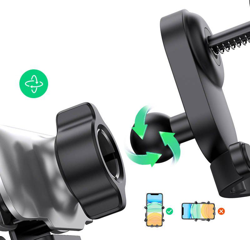 Гравитационен механизъм (One-Hand Operation): Това е най-голямото предимство на стойката. Телефонът се поставя с една ръка – теглото му автоматично затваря страничните рамена на стойката. Изваждането става също толкова лесно. Това осигурява максимална безопасност и удобство по време на шофиране.