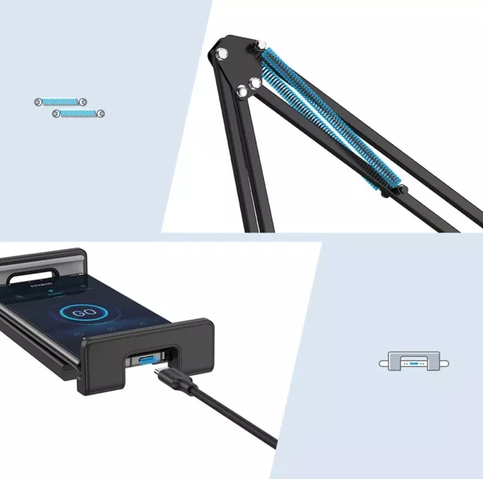 Гъвкаво позициониране: С общ обхват от 72 см и две плътни пружини, стойката позволява лесно позициониране на устройството точно пред вас. В допълнение, държачът позволява въртене на 360°, така че лесно да регулирате перфектния ъгъл на гледане.