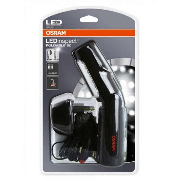 LEDinspect FOLDABLE 80 е гъвкав и здрав LED инспекционен фенер. Изключително практичена работна лампа за употреба в автосервизите, както и при лов, риболов, къмпинг, туризъм, ремонти у дома и други дейности на открито и закрито при слаба светлина.. Акумулаторната лампа, е с вградена акумулаторна батерия и може удобно да се зарежда чрез адаптер на 220V или от гнездото за запалката на 12V. Над 20 висококачествени светодиода осигуряват изключителна осветеност и дълъг живот. С цветна температура до 6000К и интензивност на светлината до 1200 лукса на разстояние 0,5 метра, преносимата LED лампа е идеалният партньор за разнообразни дейности и приложение.