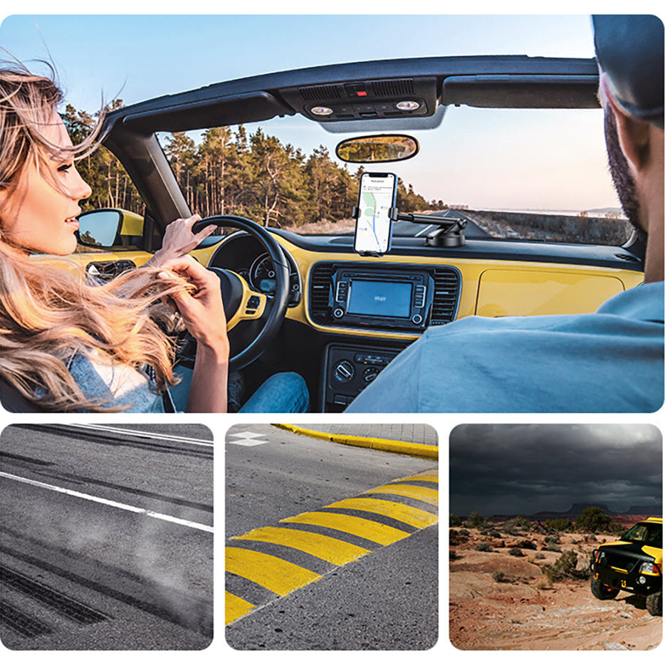 Стабилност и безопасност: Добре обмислената конструкция и гумените капаци гарантират, че телефонът ще бъде стабилизиран дори при шофиране по неравни пътища. Гумените елементи също така предпазват телефона от надраскване.