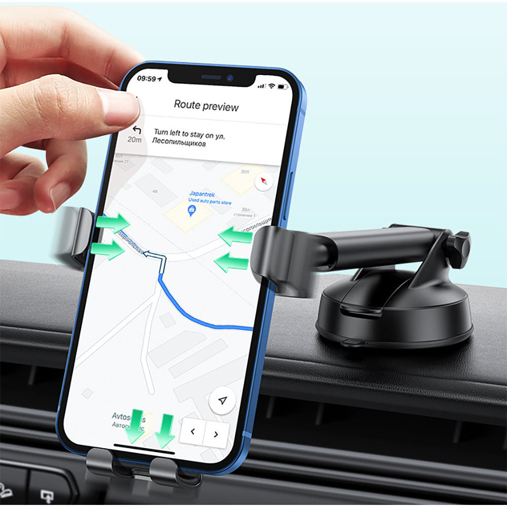 Гравитационен механизъм (Лесна употреба): Поставянето и изваждането на телефона става само с една ръка. Теглото на смартфона автоматично затваря челюстите, стабилизирайки го на място.